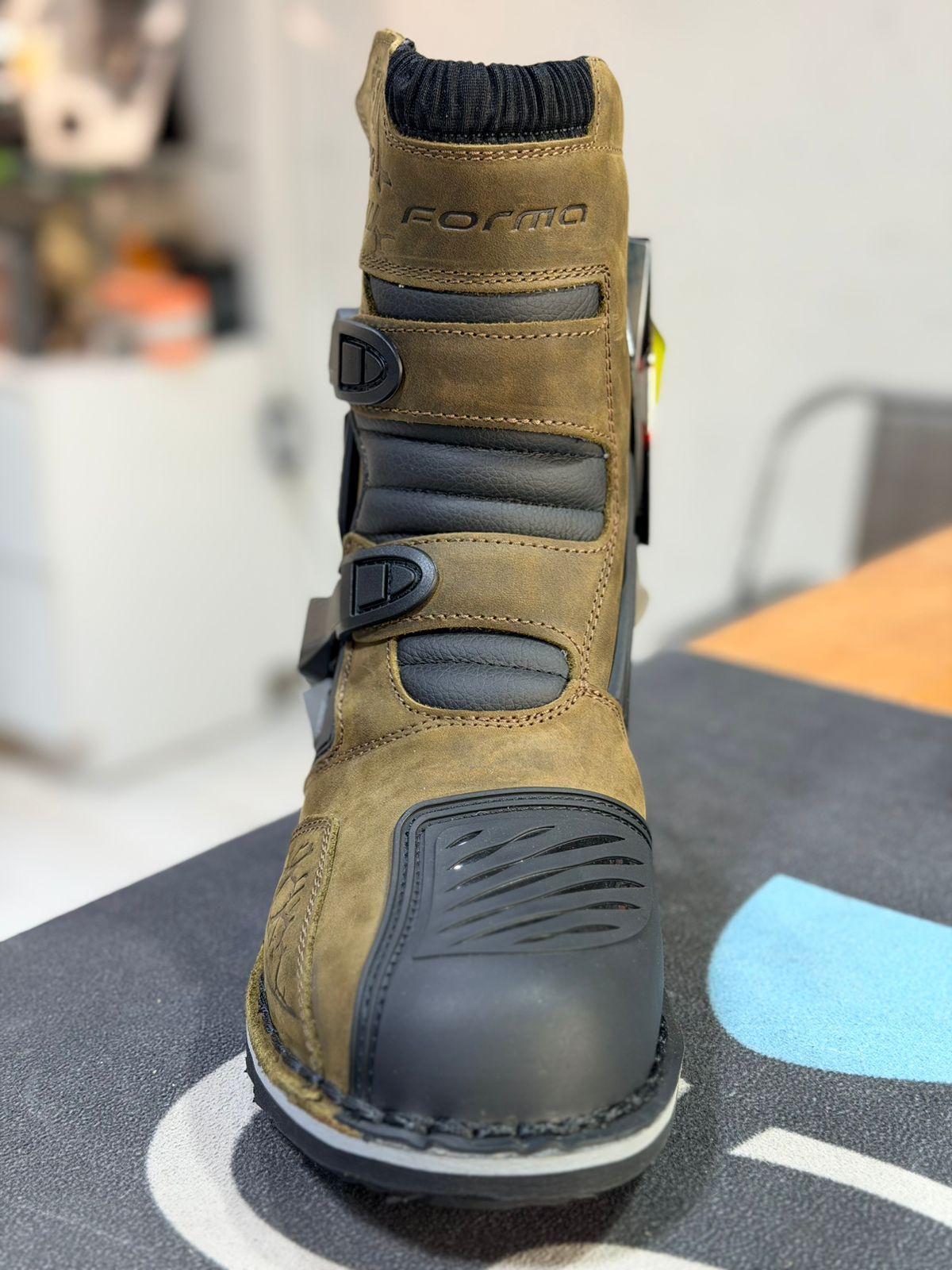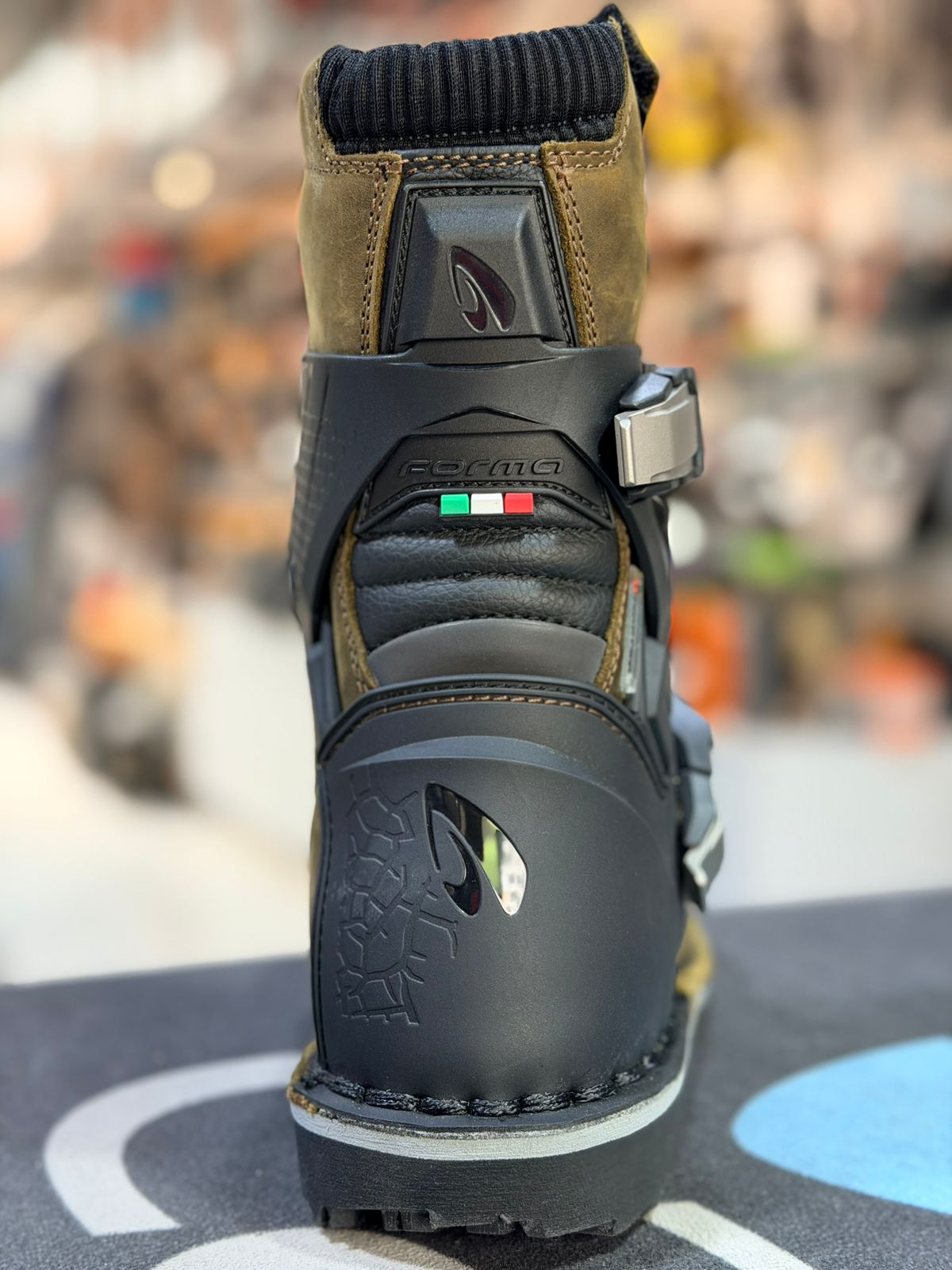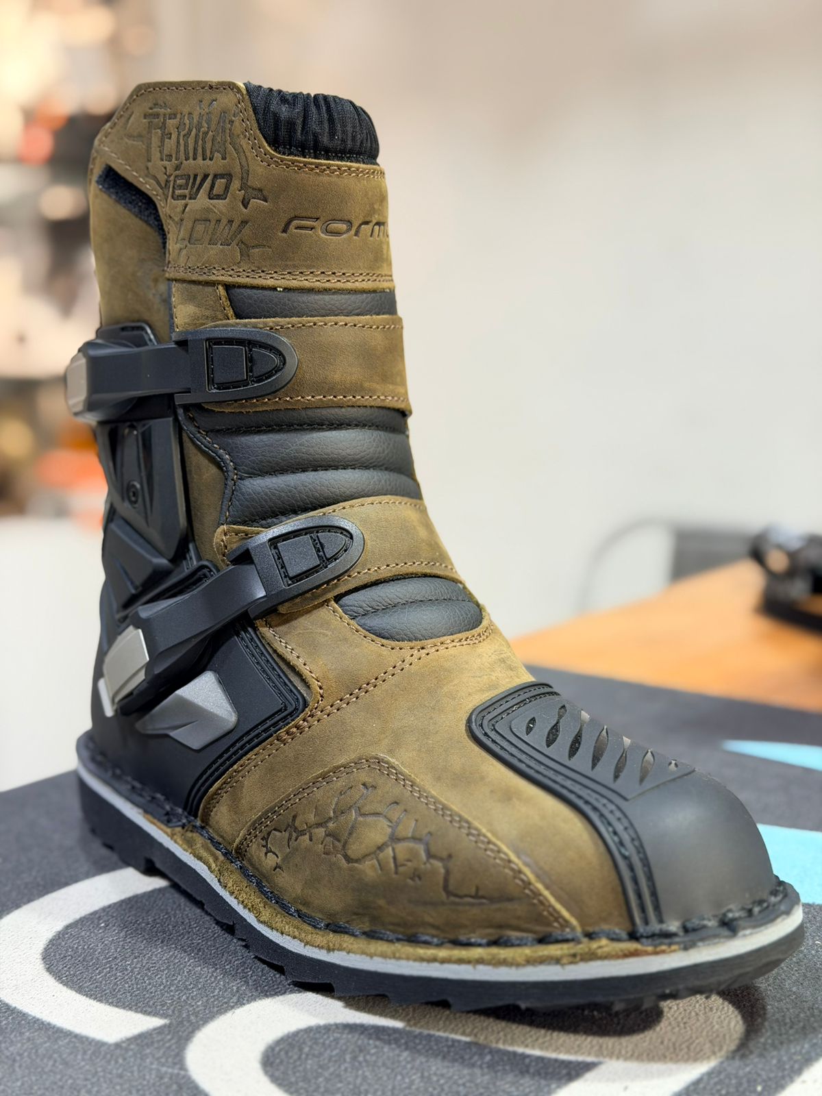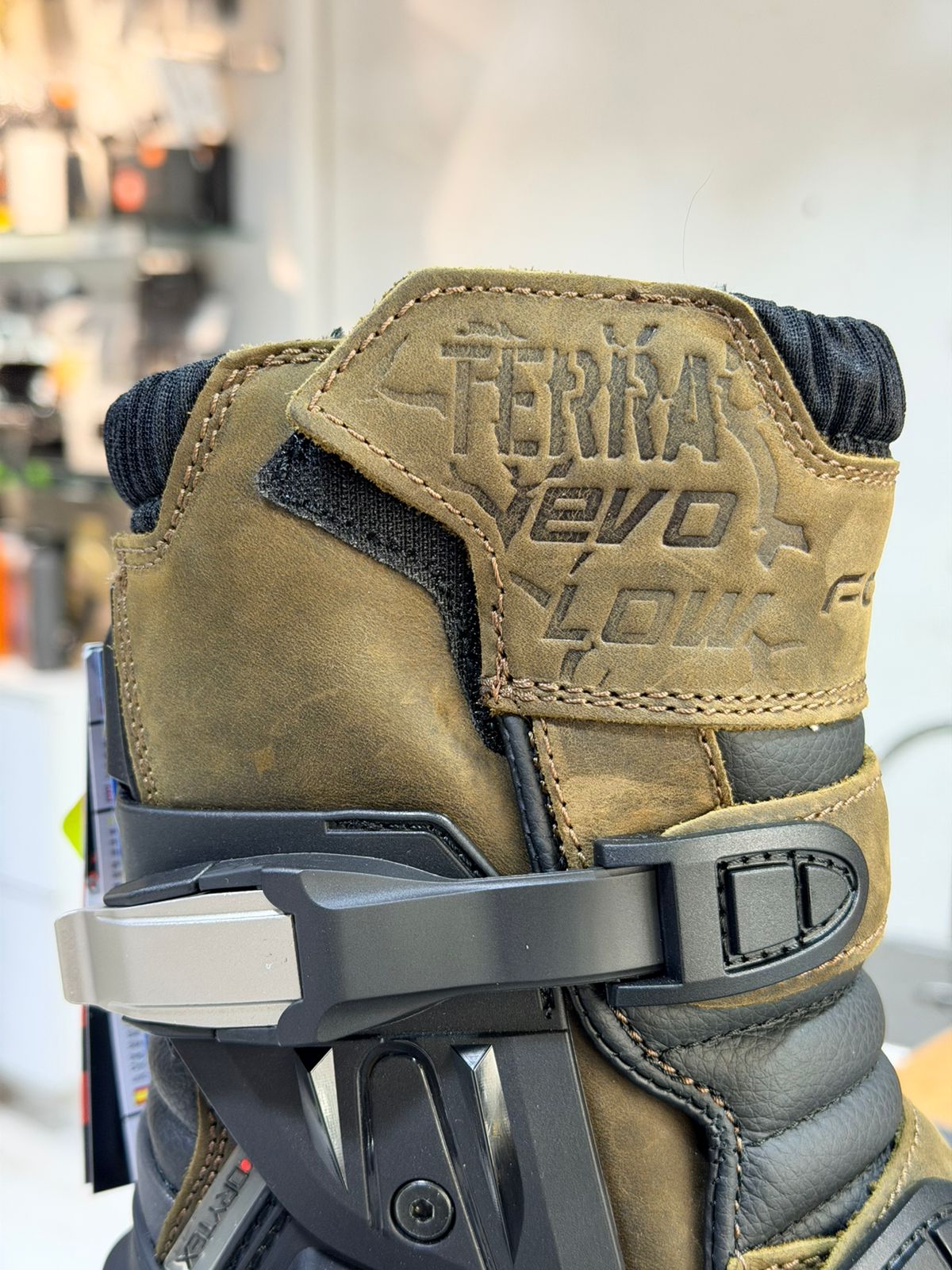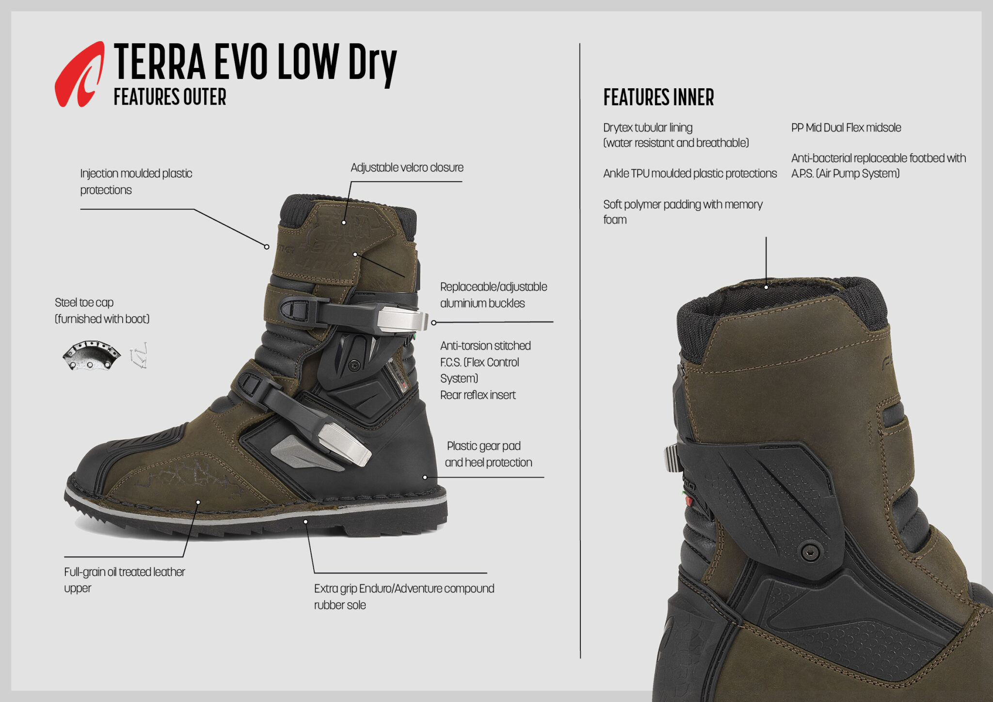 La Terra EVO Low Dry se sitúa a medio camino entre una bota de motocross y una bota de turismo, con una altura menor. La parte superior está fabricada en piel plena flor engrasada y tiene la suela cosida. El forro tubular Forma Drytex, resistente al agua y transpirable, permite su uso en cualquier condición climática.