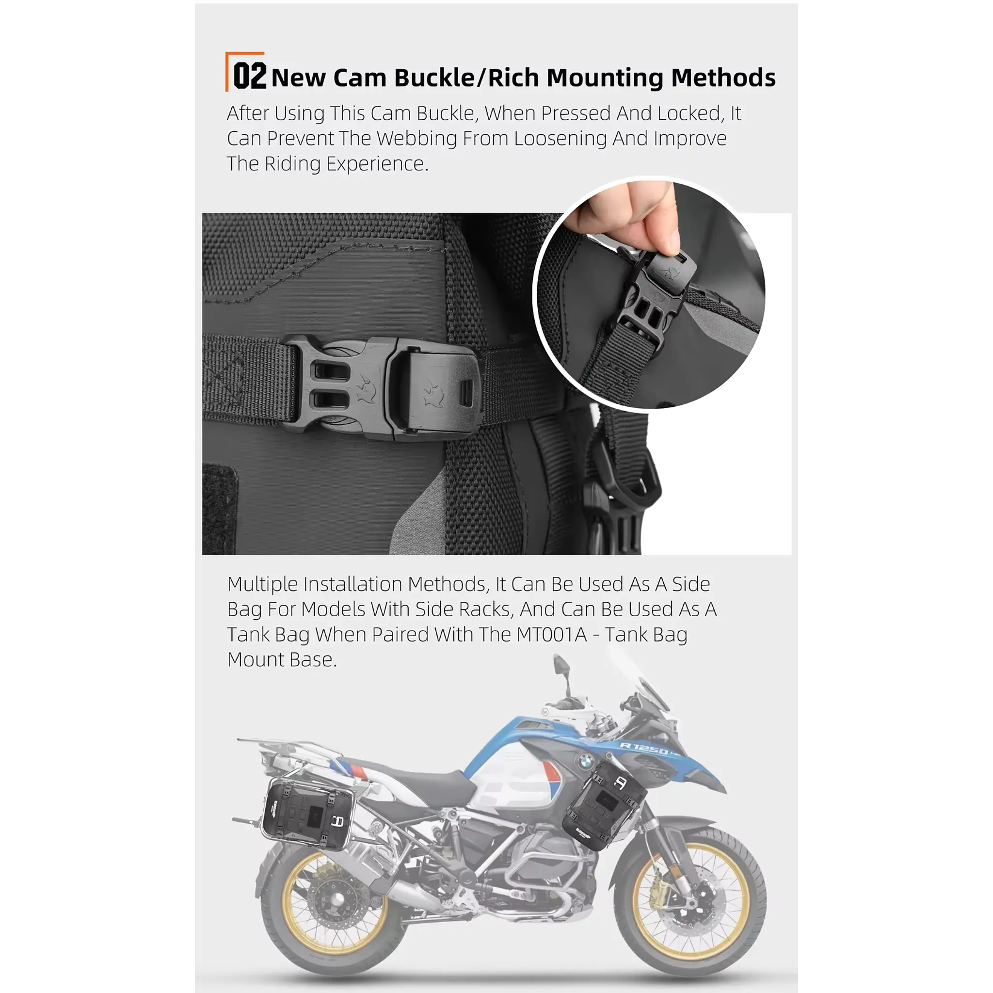 Dimensiones: 21 x 10,5 x 32/48 cm – Se adapta a la barra de protección o cola de la motocicleta, manteniendo un perfil bajo y aerodinámico.