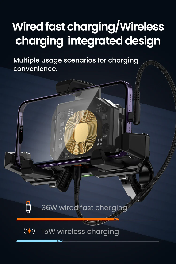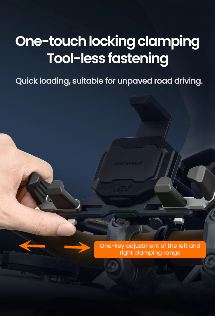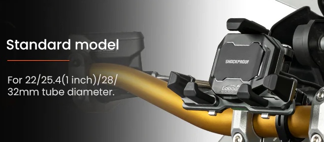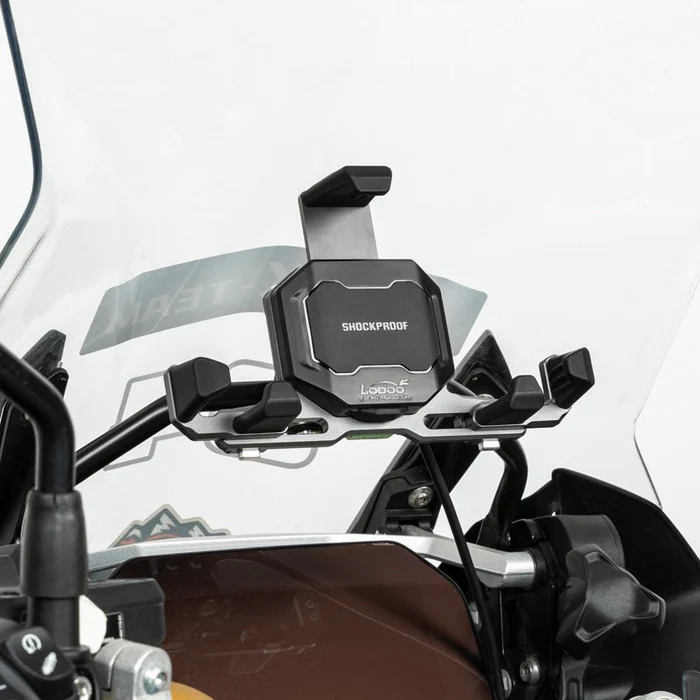 Fije su teléfono de forma segura al manillar, al espejo o al vástago de la horquilla. Proteja su teléfono con nuestro amortiguador de vibraciones. Opciones de carga disponibles.