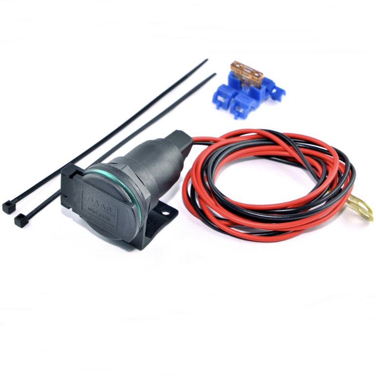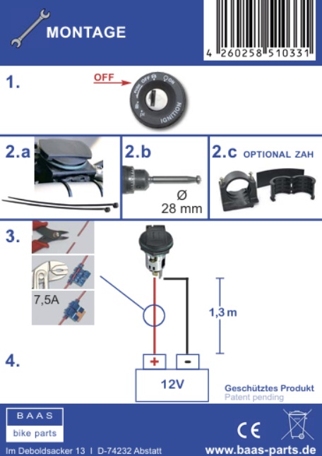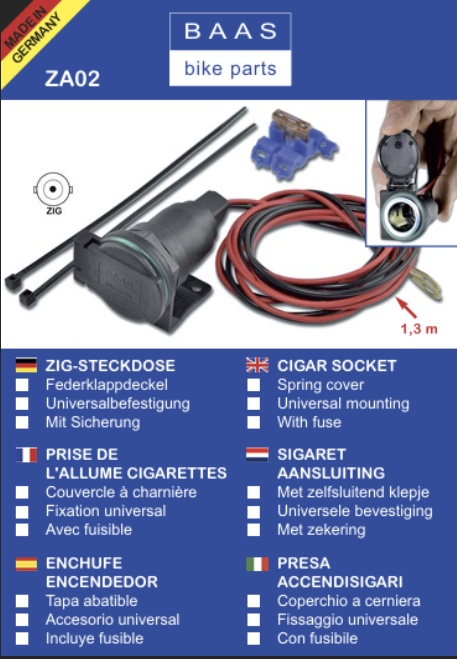 La toma USB integrada (máx. 2,1 A) convierte la tensión de entrada de 12 V a la estándar USB de 5 V. La carcasa (clase de protección IPX3), con cable de conexión de 1,5 m y terminales para el cable de la batería, permite una instalación flexible en el manillar o la barra mediante bridas. A diferencia de otras tomas similares, esta cuenta con una tapa con resorte que se cierra automáticamente después de su uso y, en lugar de ondear con el viento al conducir, se ajusta firmemente al conector USB. El interruptor de encendido/apagado integrado apaga la toma USB después de su uso, evitando así un consumo de energía constante. El LED de encendido integrado confirma el estado de encendido. Accesorios opcionales: Con el estrecho soporte de rosca ZAH, la toma se puede montar cómodamente en la barra o el manillar (22-28 mm) sin bridas.